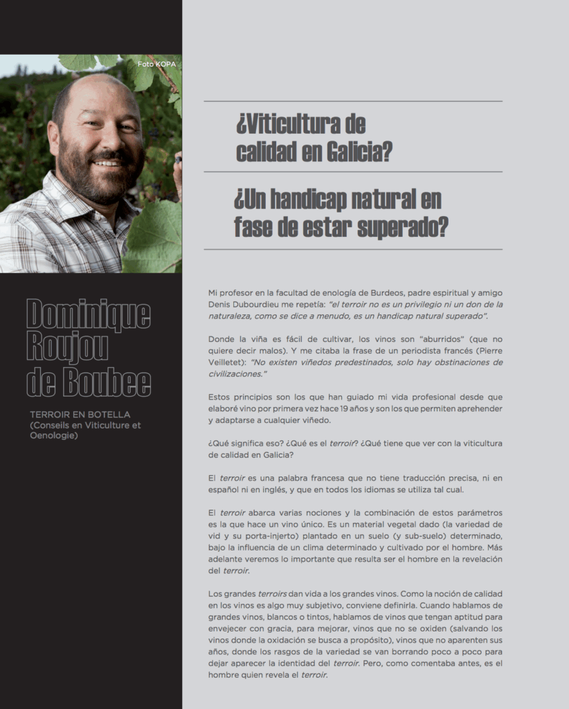 Hoy se pueden hacer buenos vinos con unos costes de producción bajos en muchos lugares del mundo. Por este motivo, la viticultura mundial para que sea rentable tiene dos grandes vías posibles: o bien hacer volúmenes importantes con un bajo coste de producción o bien crear valor. Este último es el reto más importante de la viticultura mundial. Galicia tiene todo para triunfar. Pero, entre todos, tenemos que trabajar y entender sus grandes terroirs para alcanzar esta tipicidad, esta personalidad única que permitirá cotejarse con los mejores vinos blancos y tintos del mundo. Sólo con conocimientos, exigencia y perseverancia se podrá superar un hándicap natural pero a veces también humano.